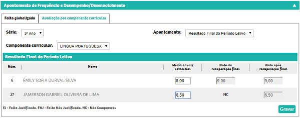 Resultado final do período letivo