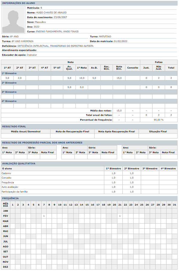 Permite visualizar as informações de cada aluno como: notas, faltas, resultado final, resultado de progressão parcial dos anos anteriores, avaliação qualitativa, frequência, se o aluno possui alguma deficiência e se o aluno recebe algum atendimento especializado.
