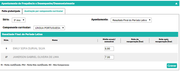 - Nota da recuperação final: que exibirá o valor informado no apontamento recuperação final.