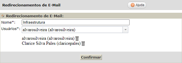 Incluir – Tela destinada à inclusão de um redirecionamento de e-mails. Os campos Nome e Usuários devem ser informados. Não há um limite de usuários a serem informados no campo Usuários, porém deve ser informado ao menos um usuário.