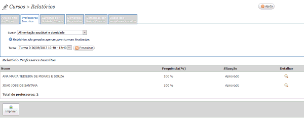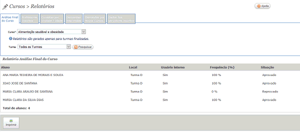 Este relatório informa o nome do aluno, a porcentagem de frequência que o cursista obteve e a situação, se ele foi aprovado ou não no curso.