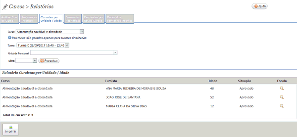 Este relatório indica o curso, o nome do cursista, a idade e a situação do aluno.