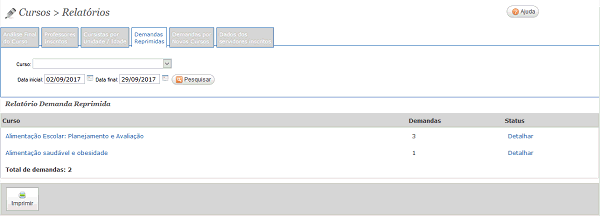 Demanda reprimida - Permite gerar relatório de demandas por novos cursos. Os campos Data inicial e Data final ajudam a refinar a busca.