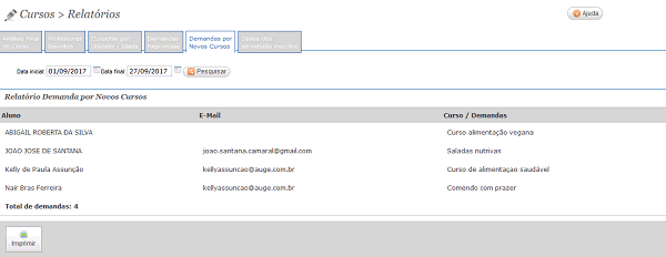 Demanda por novos cursos - Permite gerar relatório de demanda por novos cursos. Os campos Data inicial e Data final ajuda a refinar a busca.