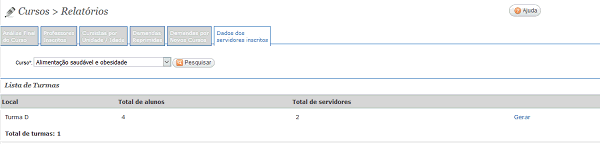 Dados dos servidores inscritos - Permite gerar o relatório dos dados dos servidores que estão inscritos nos cursos. O campo Curso deve ser informado.