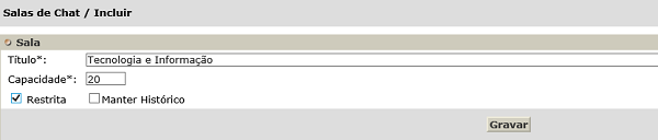 Incluir - Tela destinada a inclusão de uma nova sala de chat. Clique em Chat - Salas – Incluir. No campo Título, informe o nome da sala do chat. No campo Capacidade informe quantos usuários poderão participar do chat. Informe se a sala é 'Restrita'. Este item é opcional. Definir uma sala como restrita significa que somente determinados usuários terão acesso a ela, por isso, é necessário cadastrar quais são esses usuários através das Reservas. Na sala não restrita, todos os usuários logados terão acesso ao chat. Informe se deseja 'Manter histórico'. Este item é opcional. Ao selecionar 'Manter histórico' as conversas ficam registradas, sendo permitido ao usuário visualizá-las posteriormente.