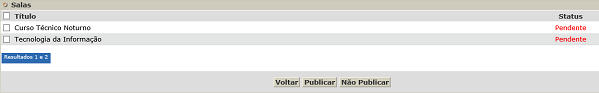 Obs. 3: caso deseje Não publicar o chat, o mesmo ficará com status 'Em Revisão' e sai da lista de registros pendentes para publicação, podendo ser excluído. Para não publicá-lo selecione o registro desejado, clique no botão Não publicar e em Ok para confirmar a ação.