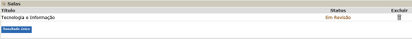 Excluir – Tela destinada a excluir uma sala de chat. Clique em Chat - Salas – Excluir. Informe a Palavra-chave referente à sala de chat que deseja excluir. Caso não seja informado nenhum dado para a busca, o sistema exibirá a listagem de todos os chats que estejam disponíveis para exclusão. Clique no botão Localizar. Será exibida a tela com a listagem dos chats conforme os dados da busca. Clique no ícone Excluir