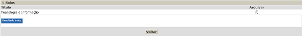 Arquivar – Tela destina a arquivar uma sala de chat. Clique em Chat - Salas – Arquivar. Informe a Palavra-chave referente à sala a ser arquivada. Caso não seja informado nenhum dado, o sistema exibirá a listagem de todos os chats publicados.