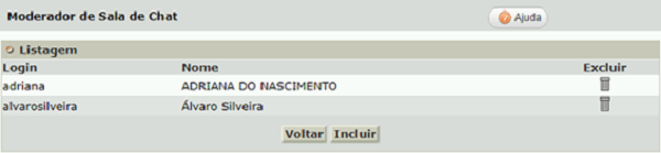 Incluir - Tela destinada à incluir moderadores. A inclusão de moderadores pode ser feita ao inserir uma sala ou entrevista ou nos registros que estejam disponíveis para alteração, com status ‘Pendente’ ou ‘Arquivo morto’. Clique em Chat - Salas ou Entrevistas – Alterar e clique sobre o título referente à sala ou entrevista desejada.