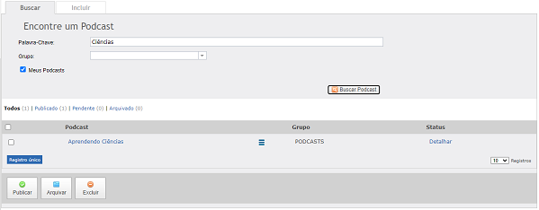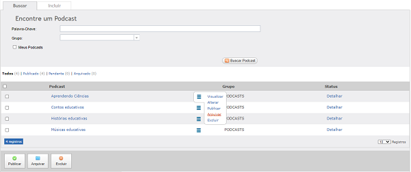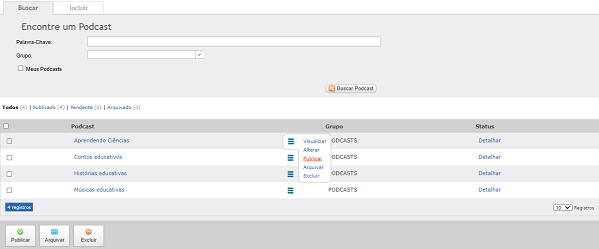 Publicar – Tela destinada à publicação de um podcast na interface. A publicação poderá ser feita ao término da inclusão, ou para podcasts com status ‘Pendente’, ou para podcasts com status ‘Arquivados’. Na tela de busca, clique no ícone