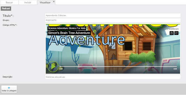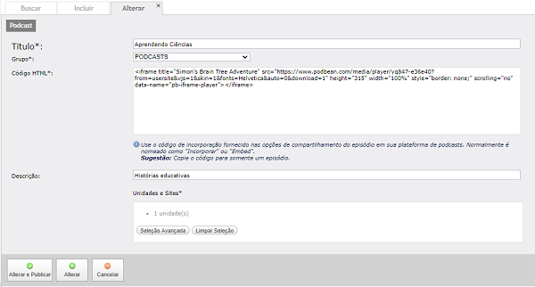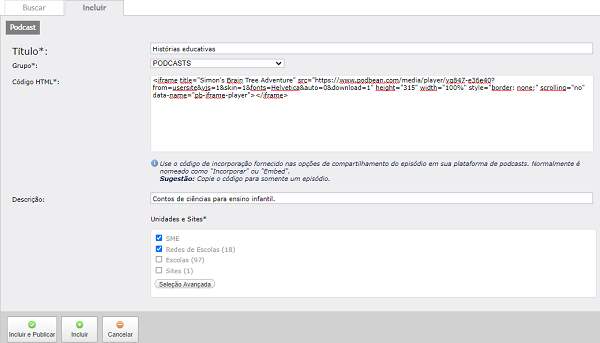 Incluir – Tela destinada à inclusão de podcasts. Os campos Título, Grupo, Código HTML e Unidades e sites devem ser informados. O campo Descrição pode ser informado. No campo Código HTML o código de incorporação fornecido, normalmente é nomeado como “Incorporar” ou “Embed”. A informação inserida no campo Descrição será exibida quando o usuário clicar para detalhar o podcast na interface.