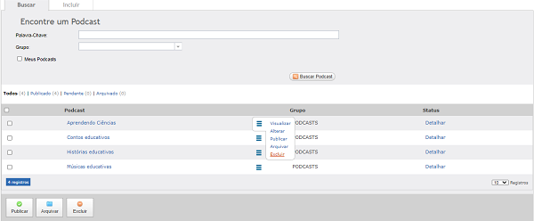 - ‘Arquivado’: para podcasts que já foram publicados e arquivados na sua unidade.