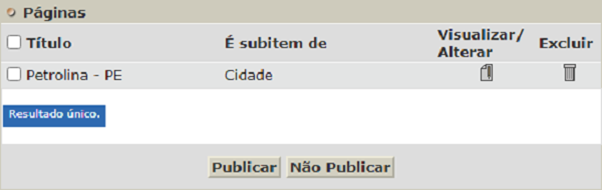 Publicar - Funcionalidade destinada à publicação de páginas. Para publicar uma página clique em Por unidade > Menu principal > Páginas > Publicar e a tela com a lista de páginas disponíveis para publicação será exibida.