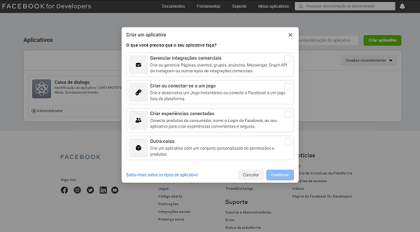 Os campos Nome de exibição do aplicativo e Email de contato do aplicativo são de preenchimento obrigatório. Caso possua uma conta de gerenciador de negócios do Facebook, ela poderá ser informada no campo Você tem uma conta de Gerenciador de Negócios?.