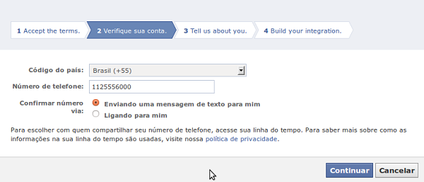 6- Informe um número de celular para o qual o Facebook deverá entrar em contato, incluindo o DDD. Exemplo: (1125556000), onde os dois primeiros dígitos (11) são referentes ao código da região. Verifique se a opção Brasil (+55) está selecionada no campo Código do país. Recomendamos selecionar a opção Enviando uma mensagem de texto para mim, pois a ligação poderá ser em inglês.