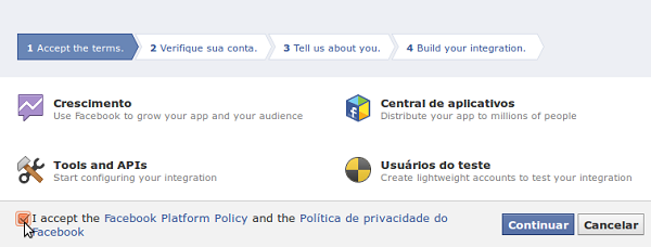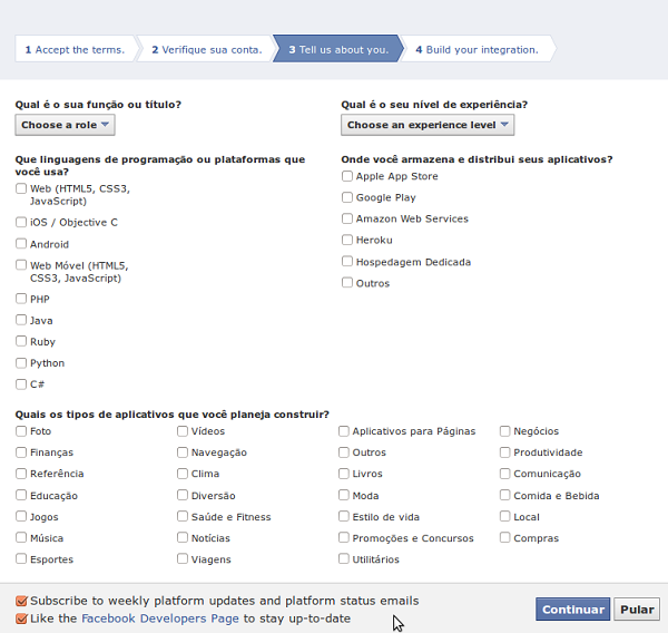 O Facebook pedirá informações sobre seus interesses em desenvolvimento. Não é necessário marcar alguma opção. Logo abaixo, há dois checkboxes marcados por padrão. Caso não queria receber notificações por e-mail sobre a área de desenvolvimento do Facebook ou curtir a página dos desenvolvedores, você poderá desmarcá-las.